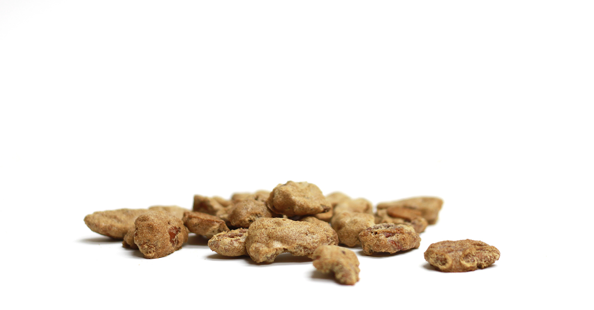 I use those giant mammoth pecans. Not those teeny weenie itsy bitsy pecans. This helps create a nice nut flavor and balances nicely with the light sugary coating.